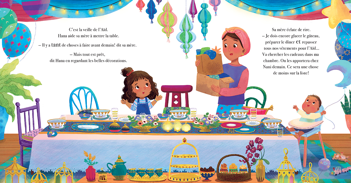 C’est la veille de l’Aïd et Hana aide sa mère à dresser la table. Hana adore les décorations colorées qu’elles ont disposées dans la maison! Il reste encore beaucoup à faire, alors quand sa maman lui demande de préparer les cadeaux de l’Aïd pour les apporter chez Nani le lendemain, Hana est prête à l’aider! Mais il y a un problème : les cadeaux ont disparu!